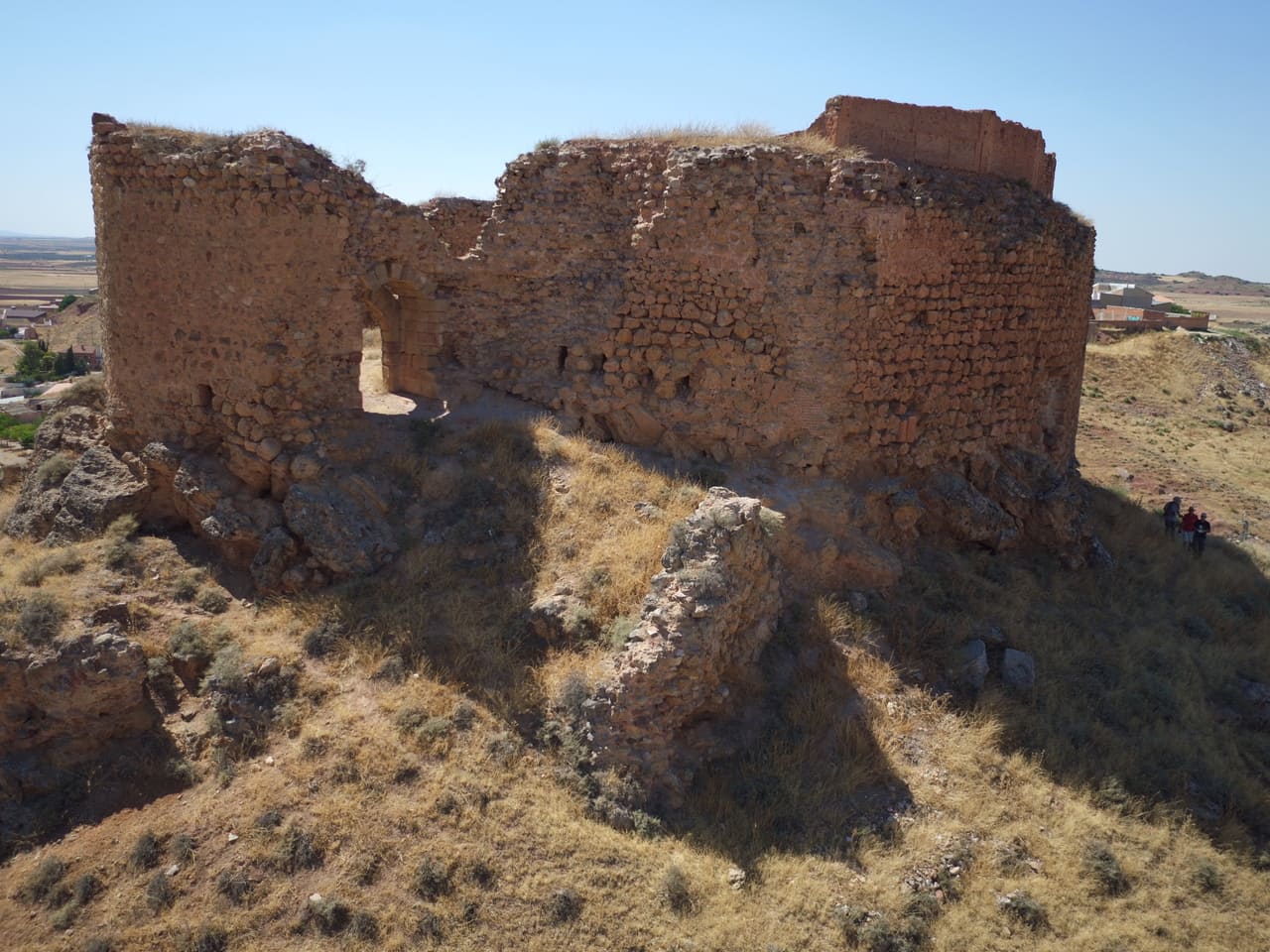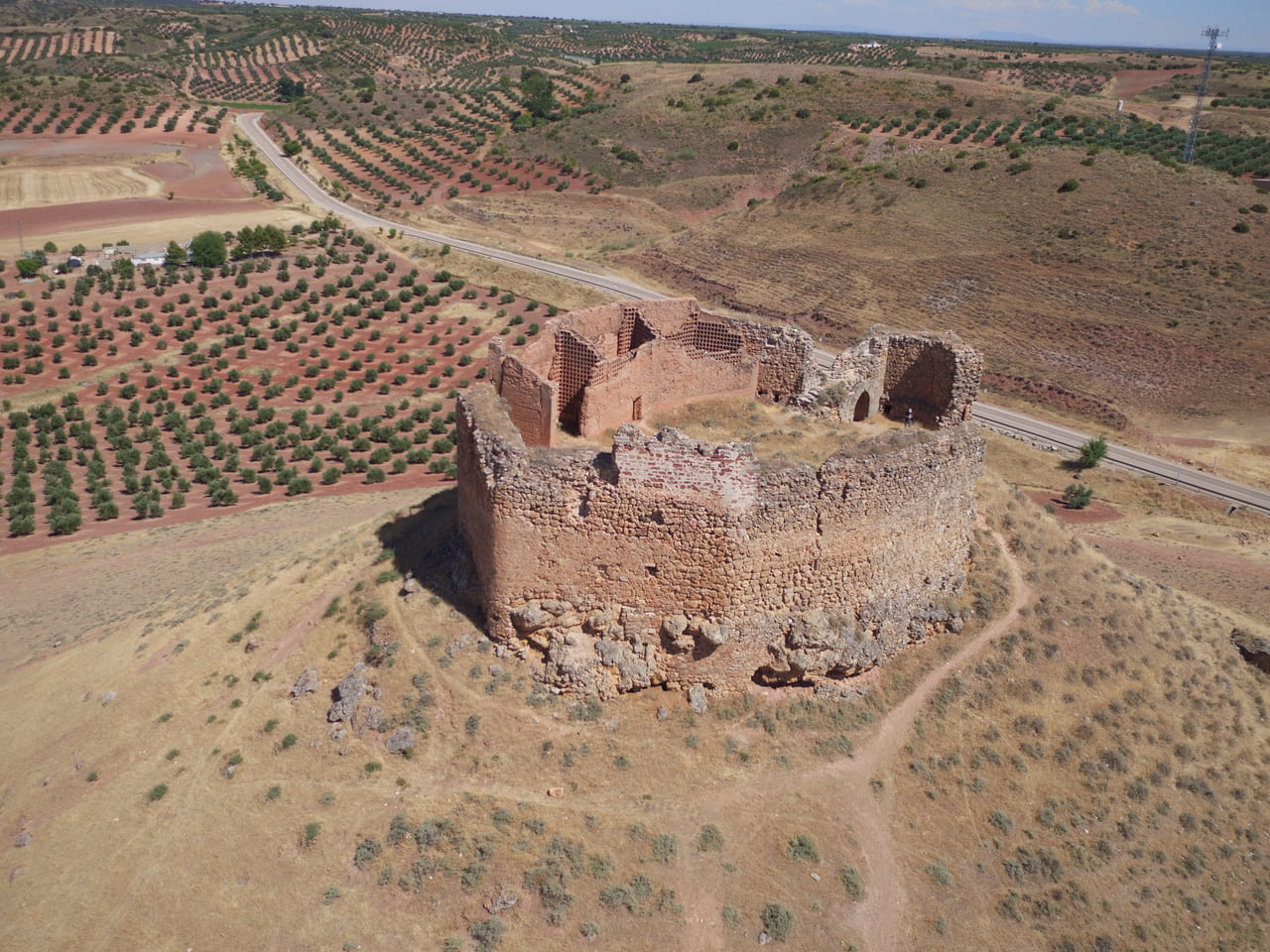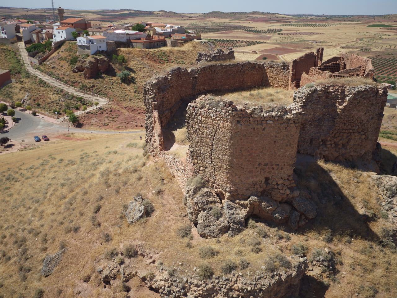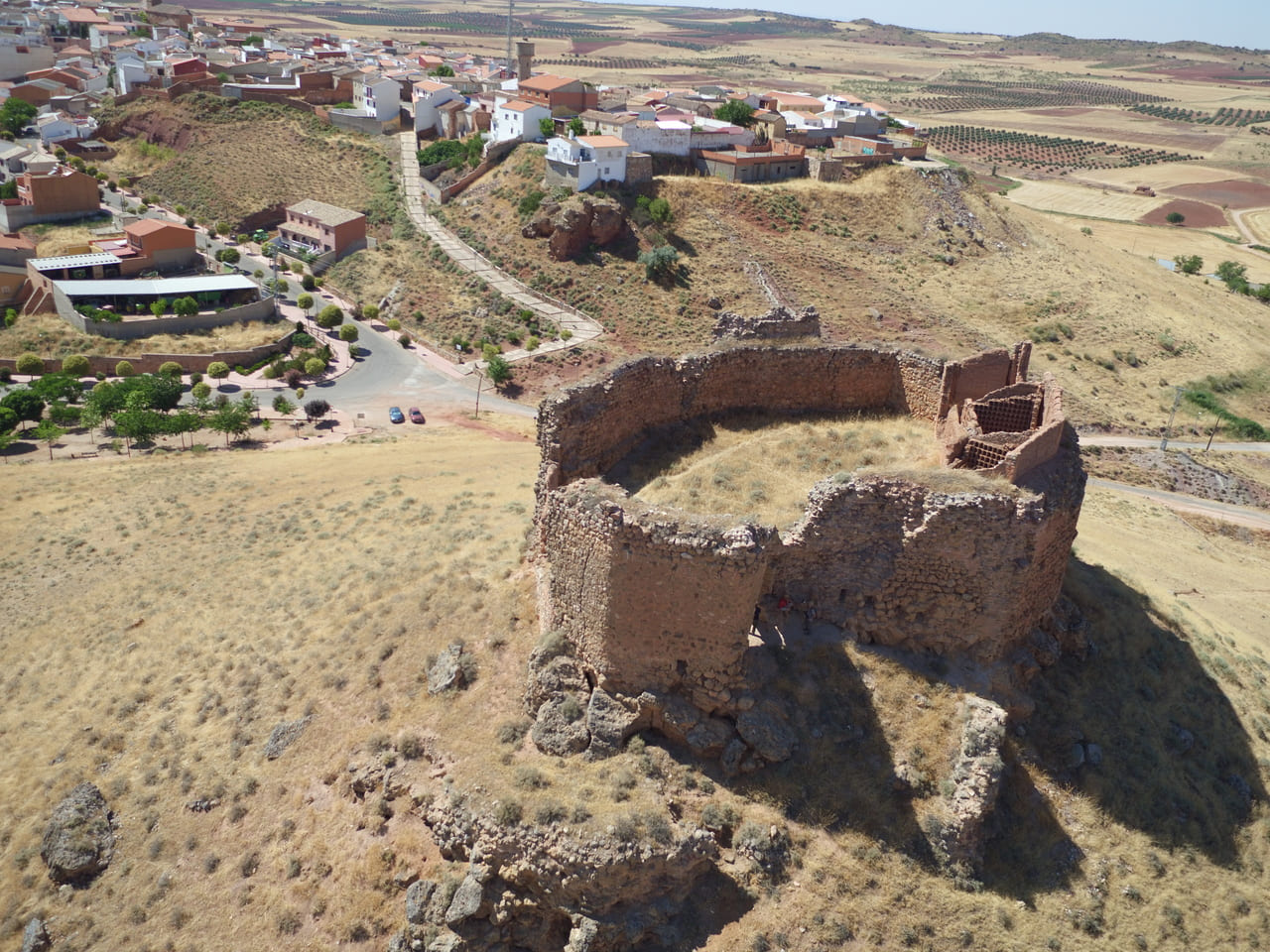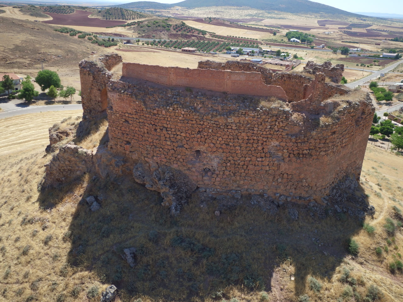 Su emplazamiento explica también su larga trayectoria histórica. La zona tuvo un valor estratégico desde la Antigüedad, vinculada al territorio de la ciudad iberromana de Laminium. En el cerro se documentan indicios de ocupación omeya y, ya en época cristiana, la plaza se consolida tras las campañas posteriores a las Navas de Tolosa: a inicios del siglo XIII pasó a la Orden de Santiago. En 1241 se organiza la encomienda y en 1243 Alhambra obtiene fuero, reforzando su papel comarcal. La fábrica del castillo se sitúa entre mediados y el último tercio del siglo XIII, con usos administrativos y de control territorial durante toda la Baja Edad Media.