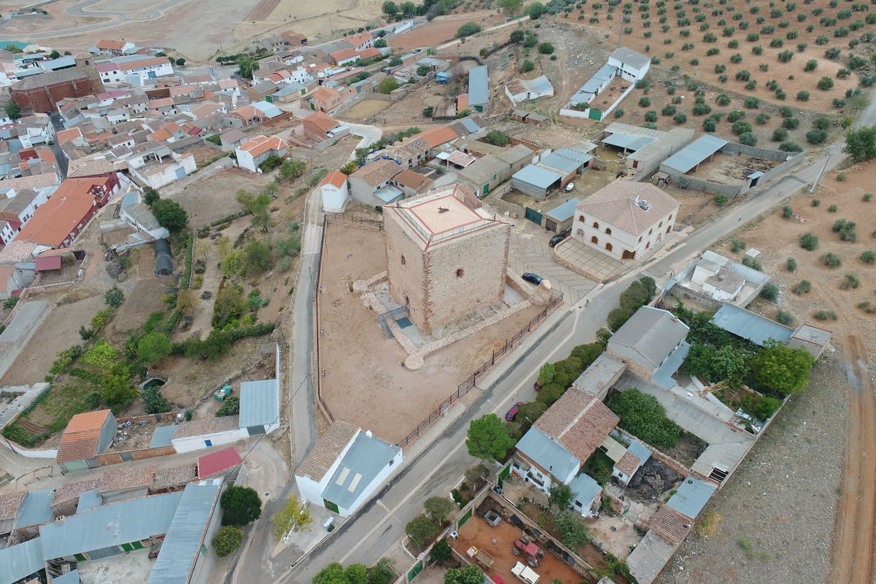 El castillo de Albaladejo se encuentra dentro del propio casco urbano, en el extremo occidental, ocupando el punto más alto y escarpado del cerro sobre el que creció la población. No es un castillo aislado en el campo, sino una pieza ligada al pueblo y a su entorno inmediato, especialmente a la parroquia, con la que forma un conjunto. Su situación ayuda a entender su función histórica: vigilar el valle y los pasos hacia Andalucía.